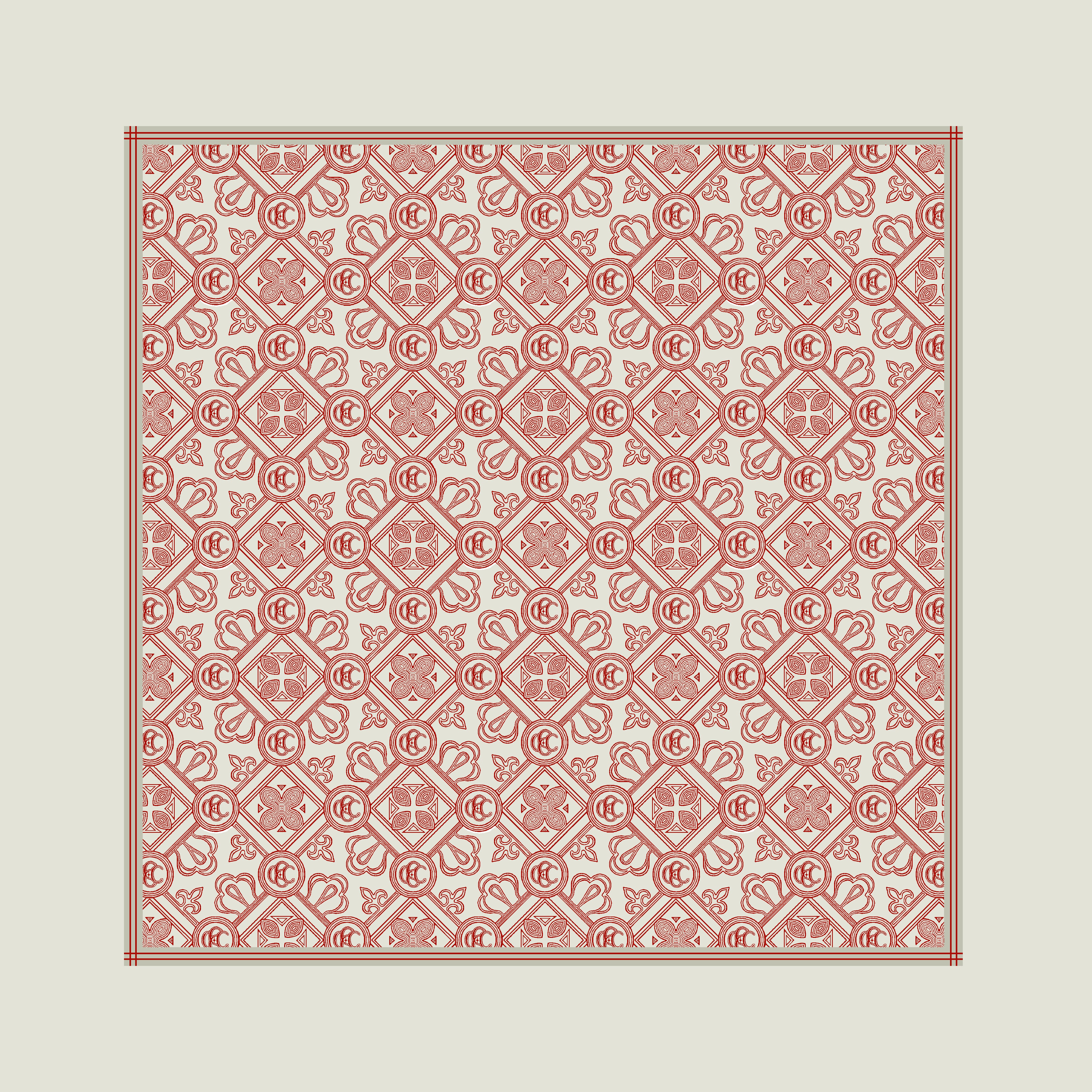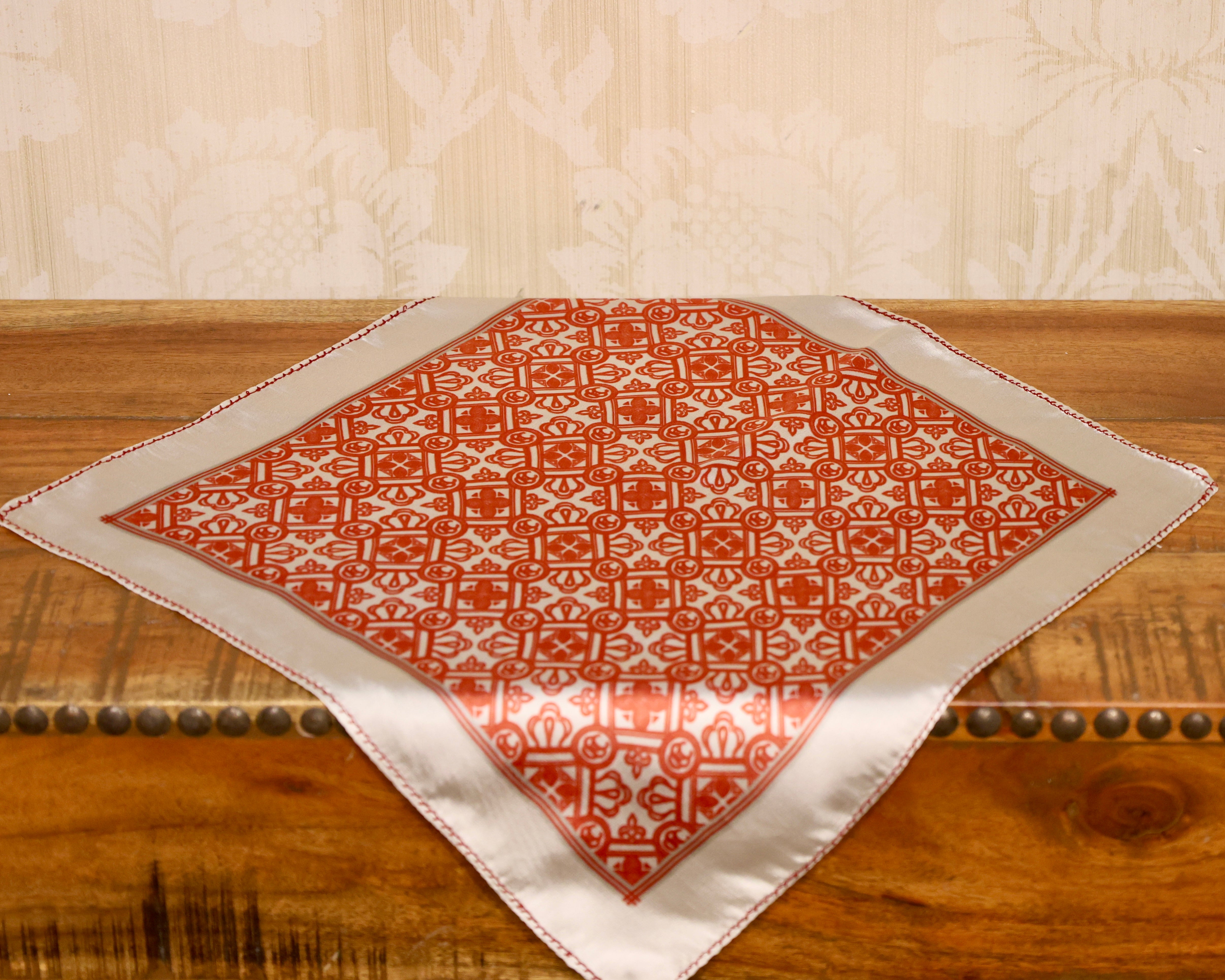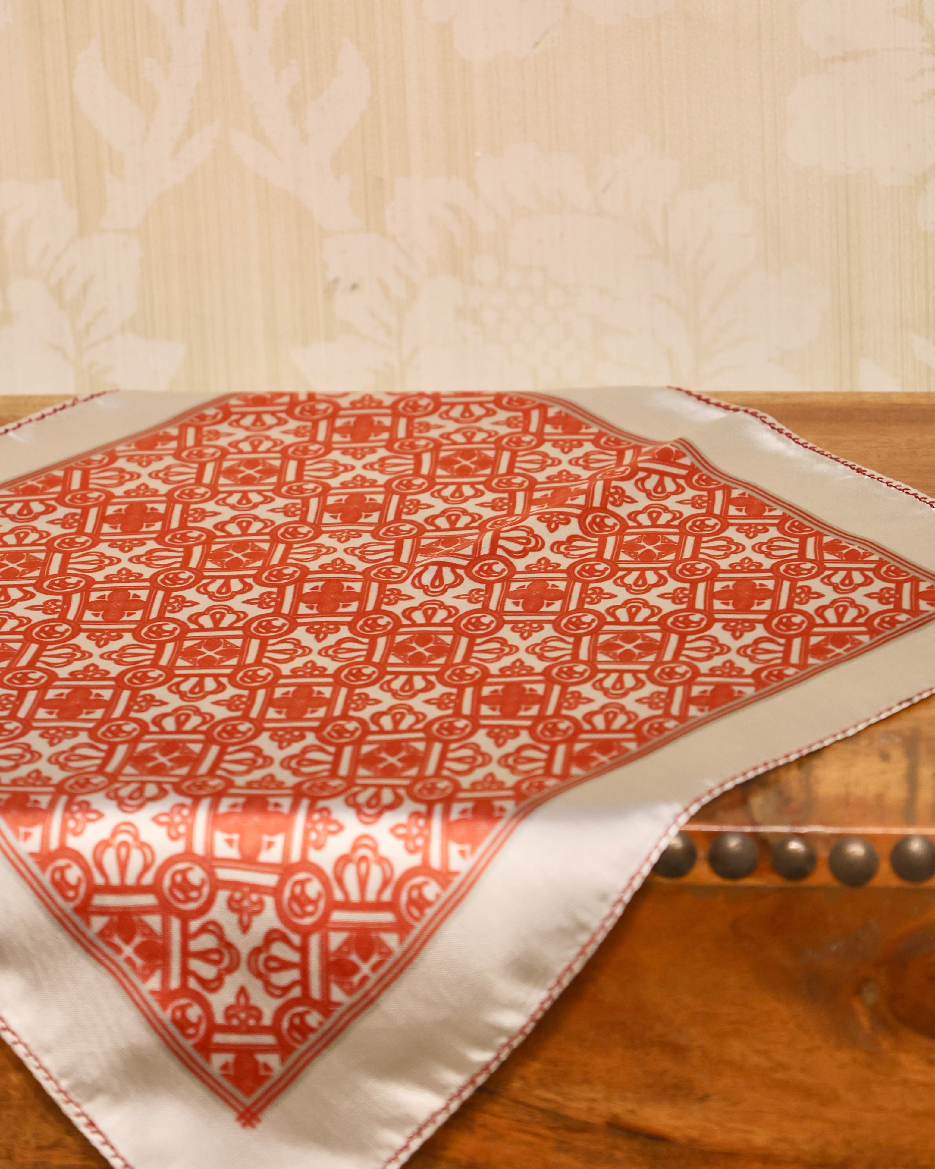 "Scarlet Maze" is an intricate geometric design that blends bold red and cream tones to form an elegant labyrinth-like structure. Its rich colour palette and detailed artistry make it a standout accessory.