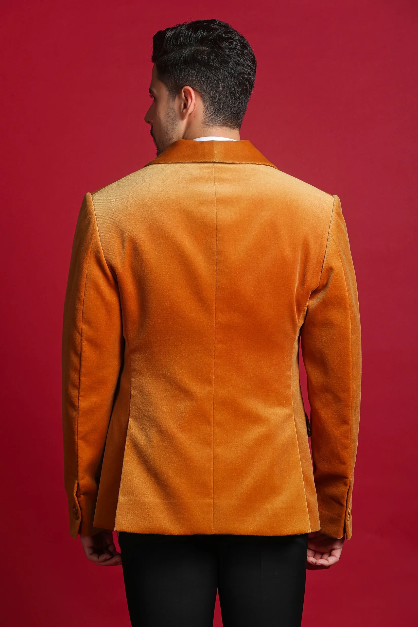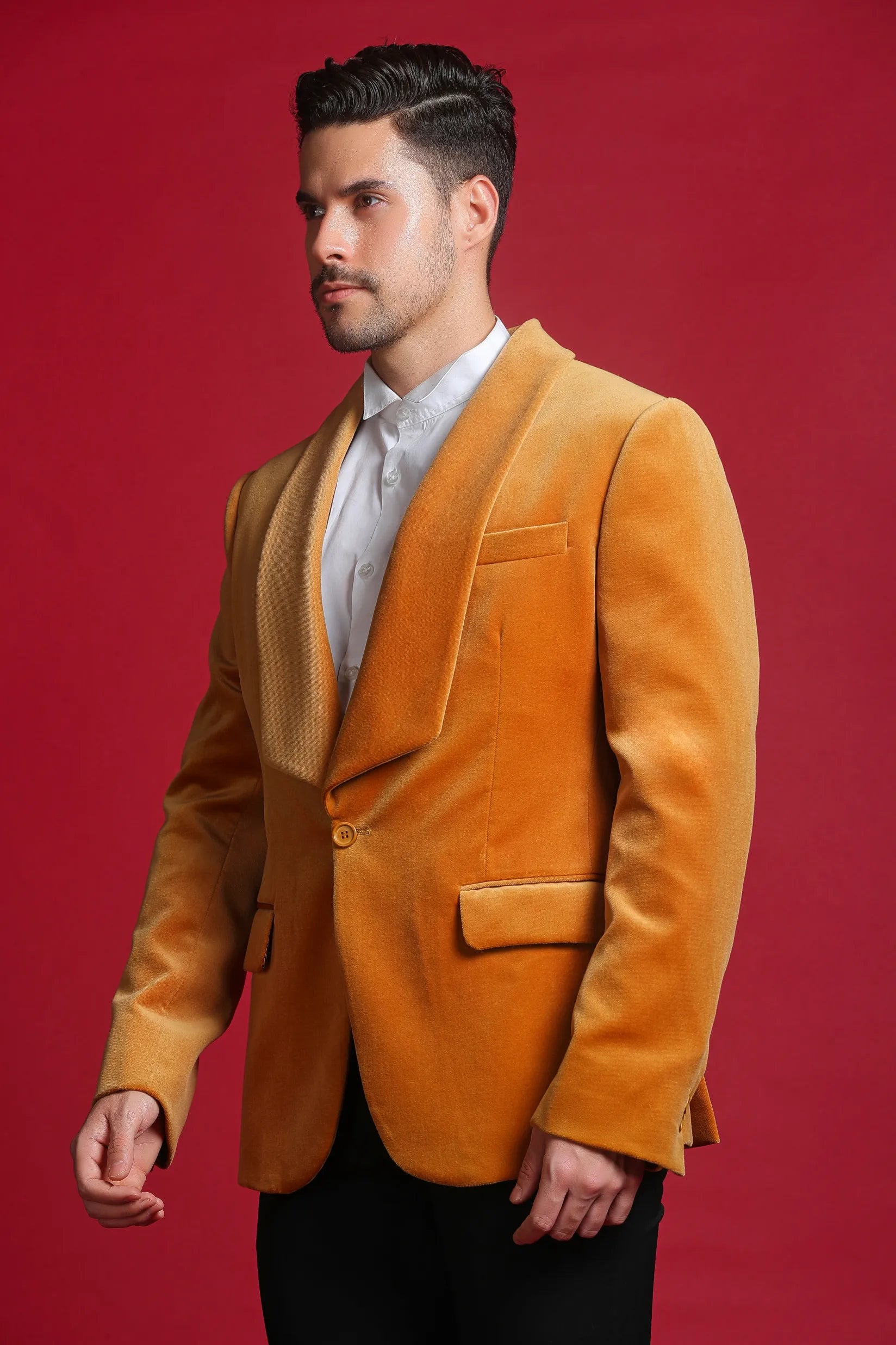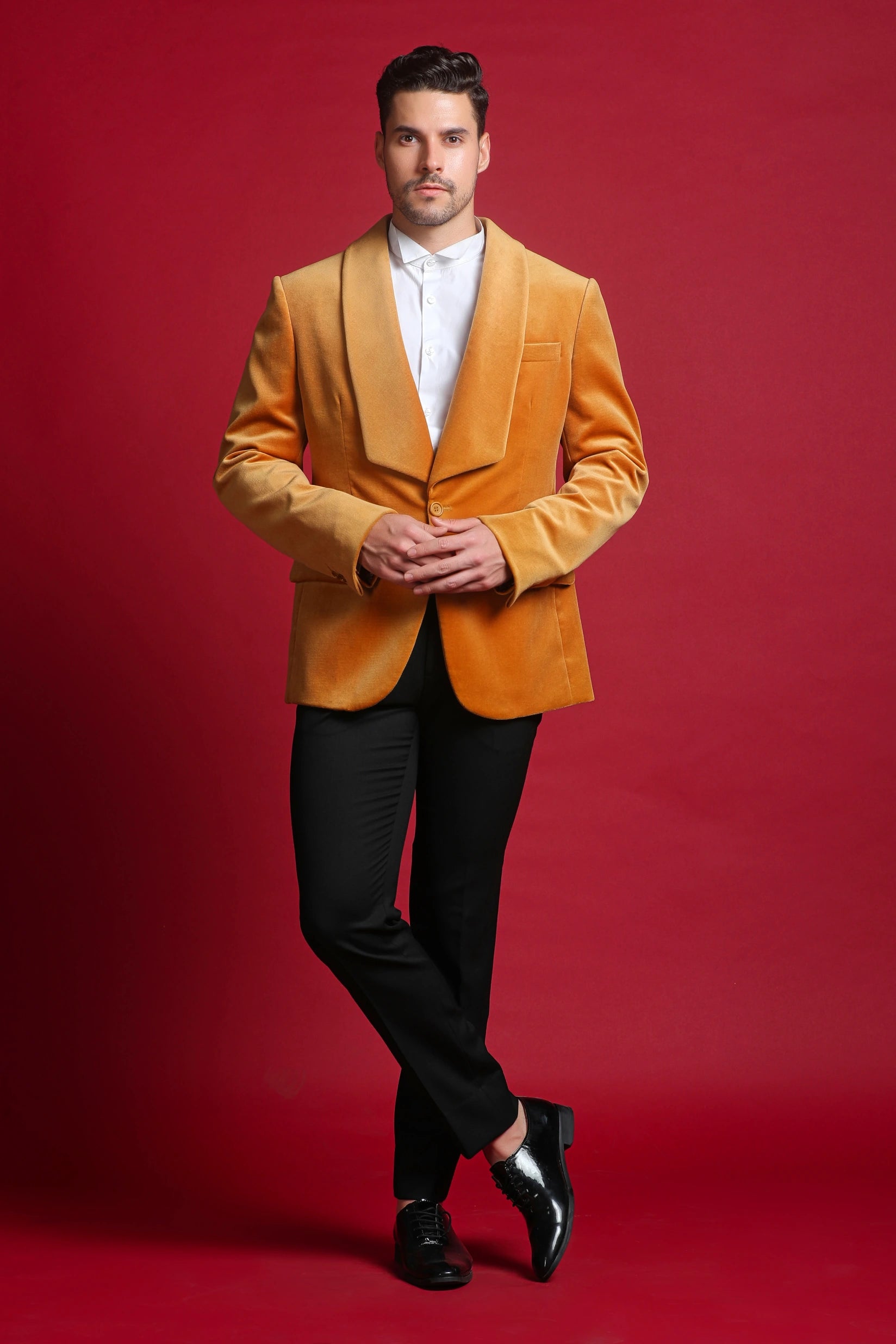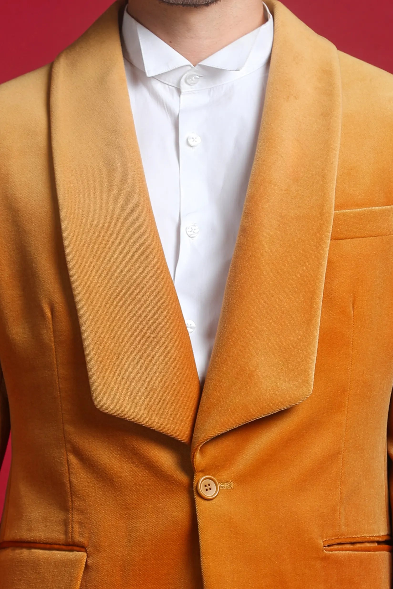 Introducing a luxurious silk velvet tuxedo jacket in a striking mustard hue. This exquisite piece features a shawl collar lapel and boasts a printed lining for a touch of sophistication. Elevate your formal attire with this to complete the look; it can be paired with breaches, pants and churidar (available under the bottoms section).