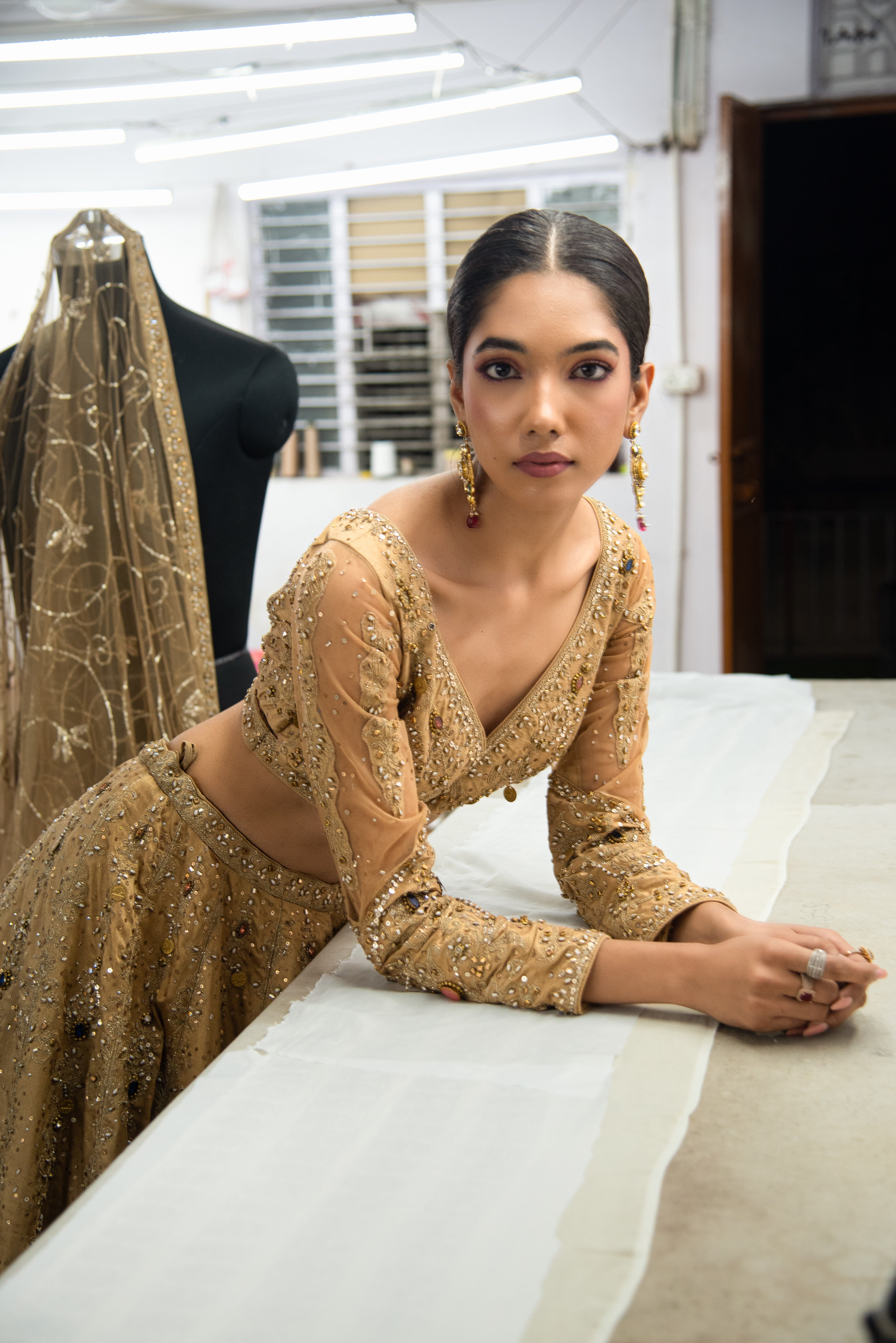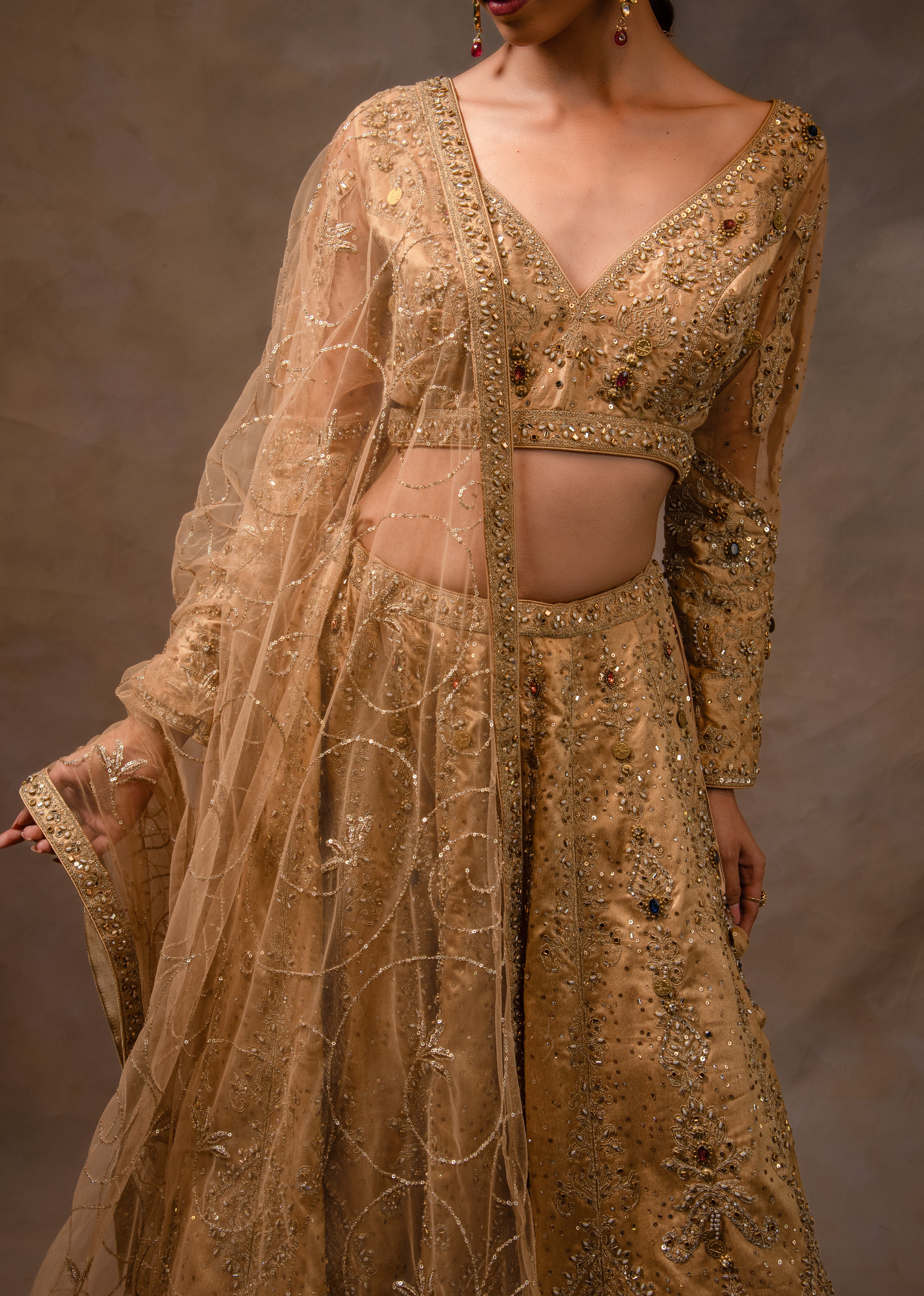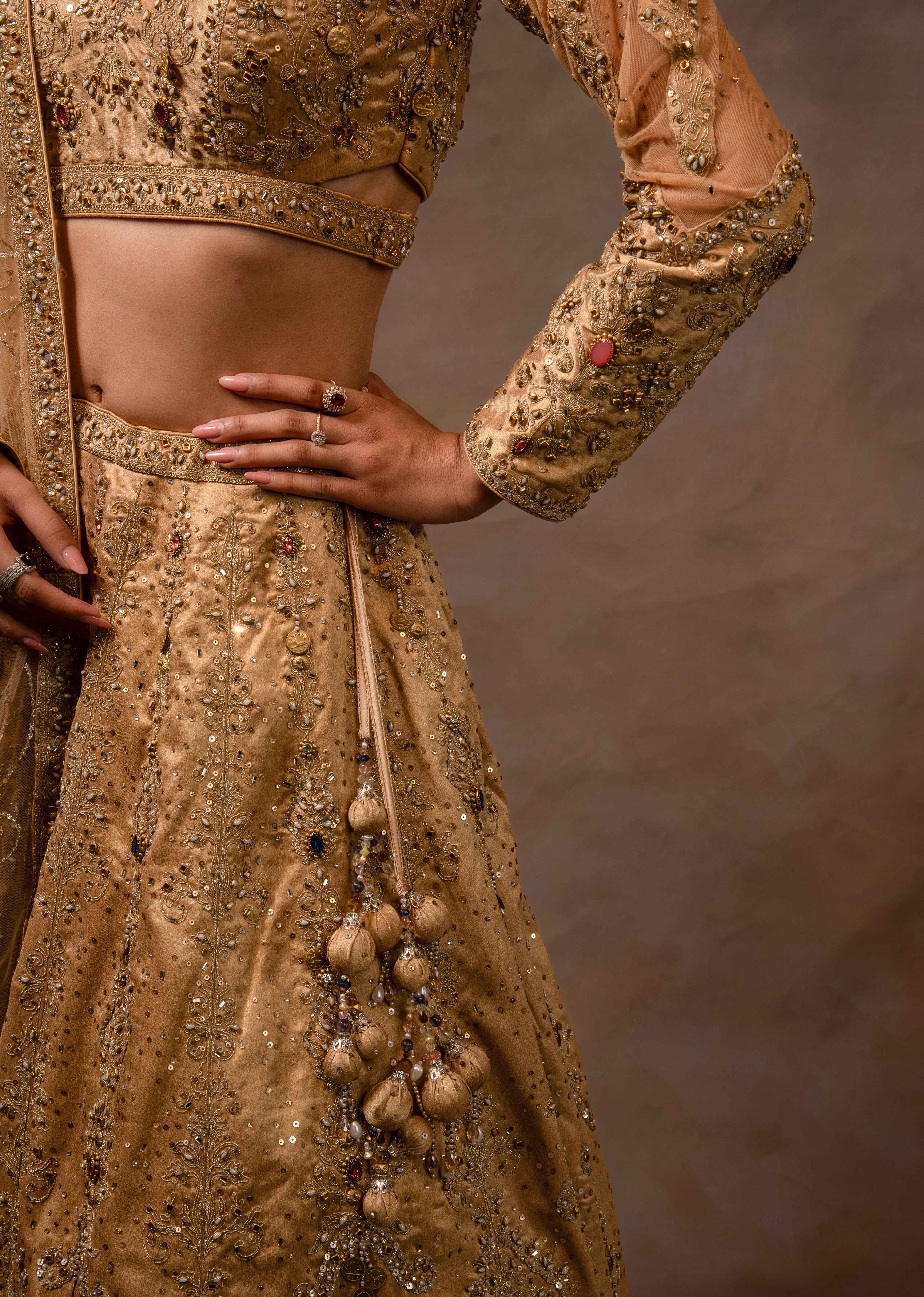 A celestial masterpiece, the Sunehra Sitara Beaded Hand-Embroidered Lehenga exudes regal elegance in a radiant golden hue. Crafted from luxurious silk, this lehenga is intricately adorned with semi-precious stones, fine beadwork, and meticulous hand embroidery, creating a breathtaking symphony of texture and detail. The full-sleeved blouse adds a touch of sophistication, while the beautifully embellished dupatta completes the look. Designed for the modern bride or bridesmaid, this lehenga is a statement of grandeur and grace.