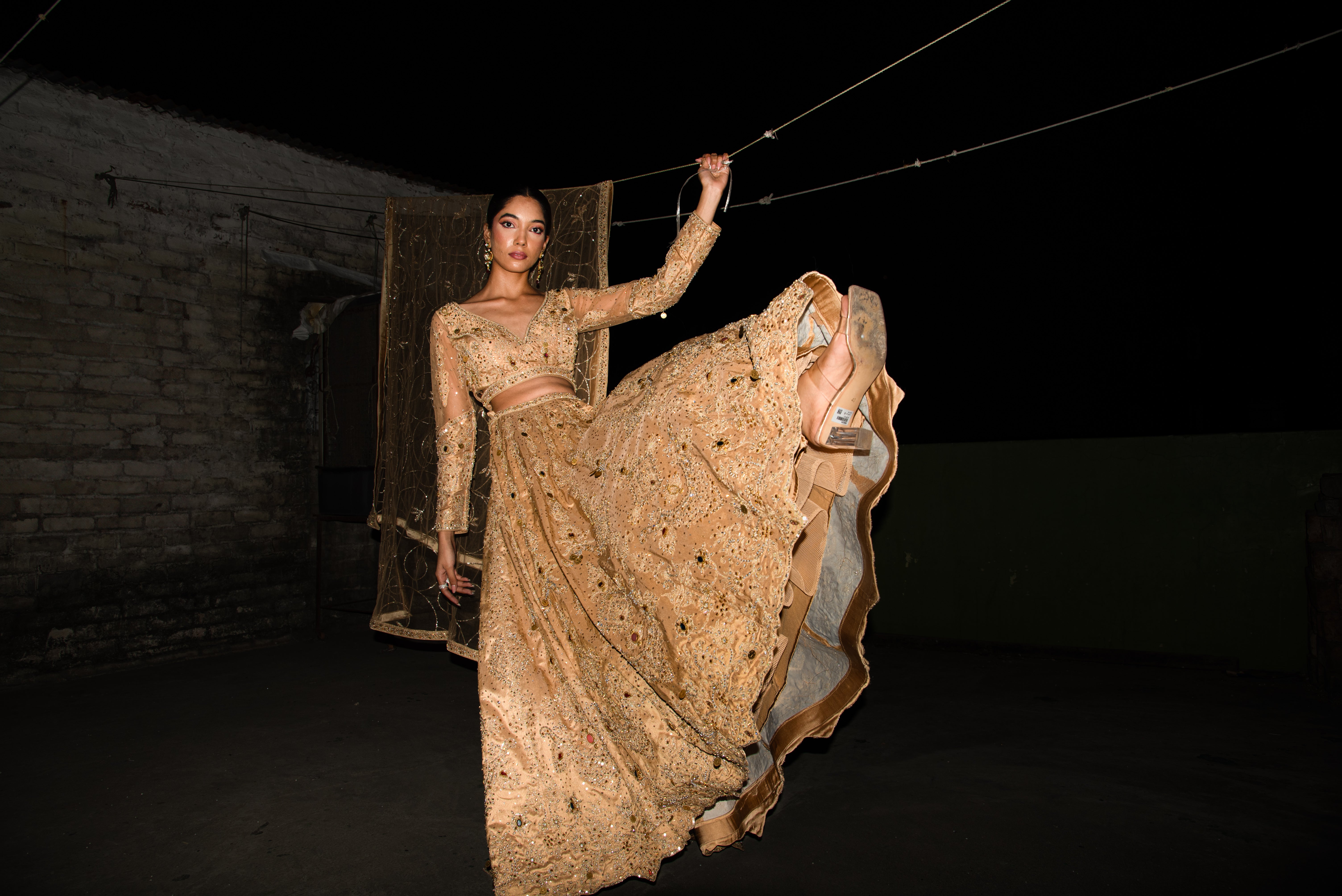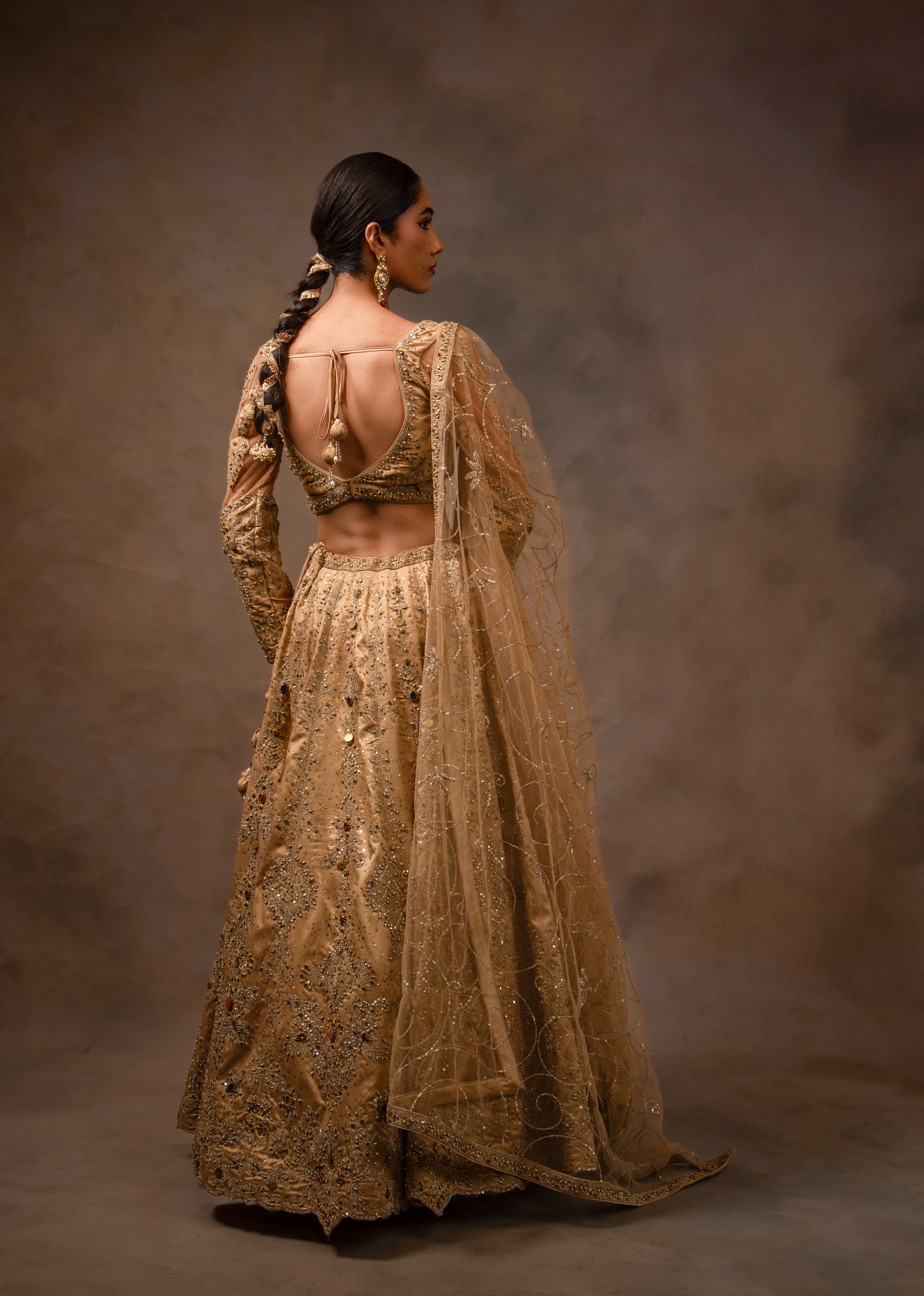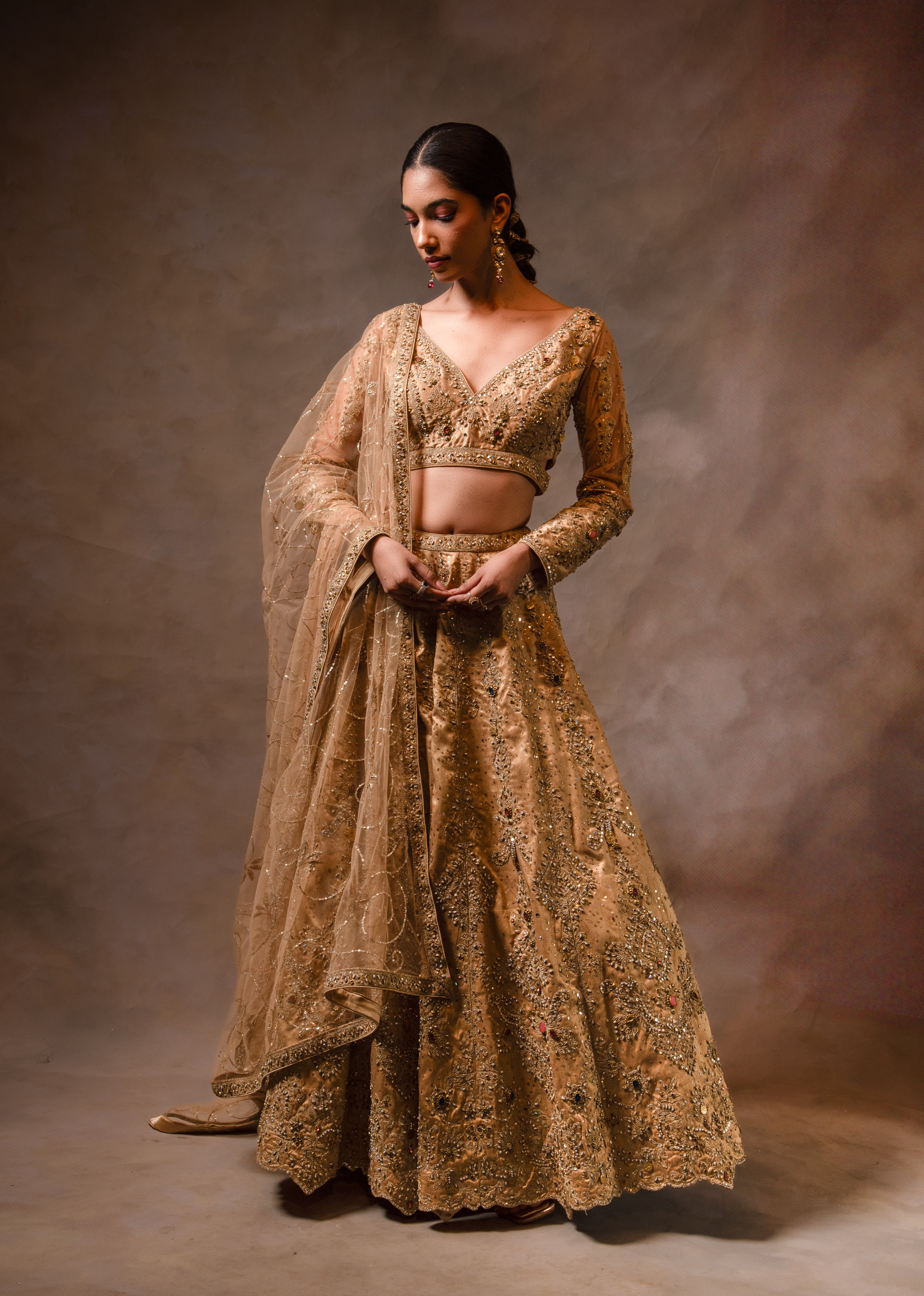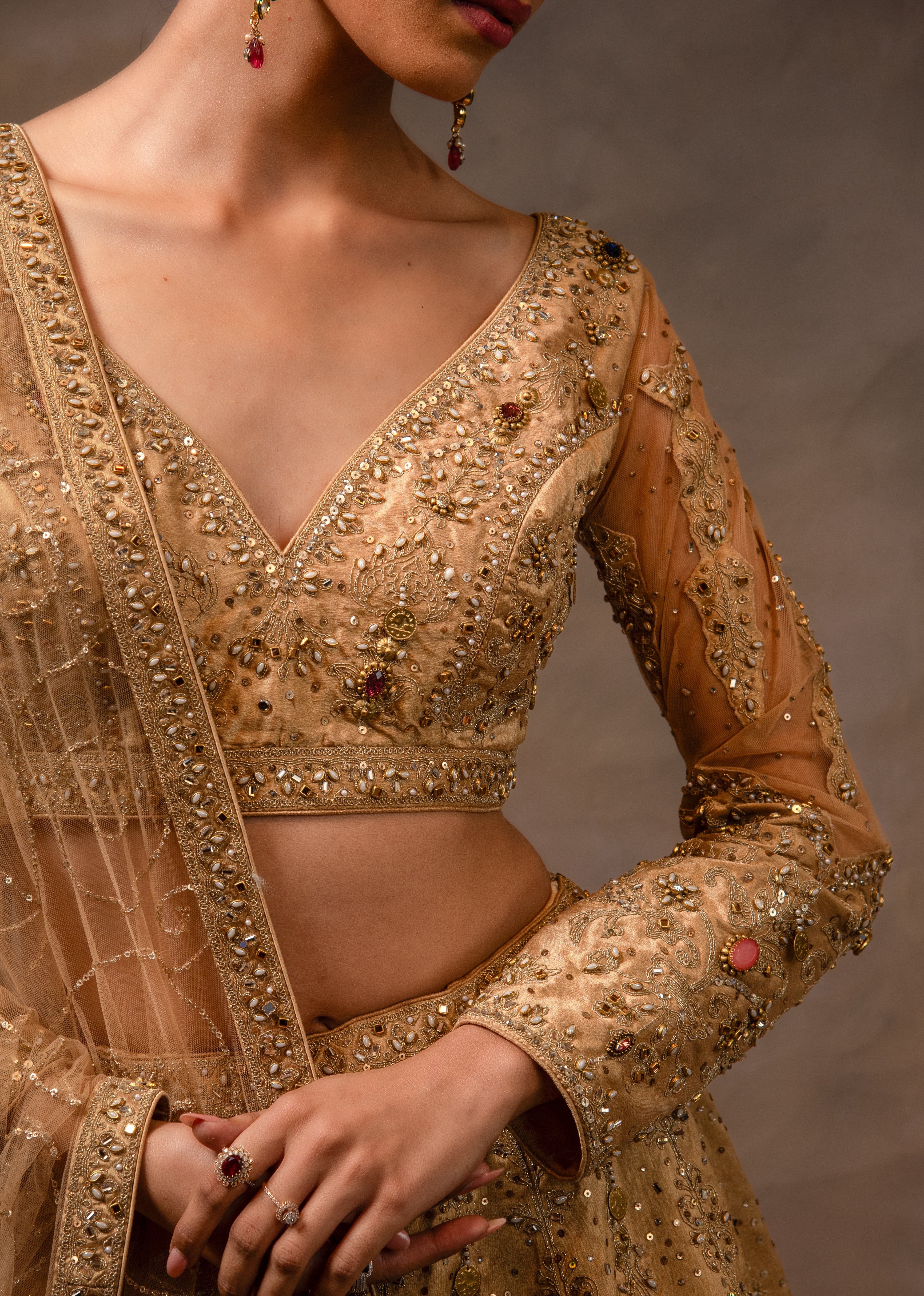 A celestial masterpiece, the Sunehra Sitara Beaded Hand-Embroidered Lehenga exudes regal elegance in a radiant golden hue. Crafted from luxurious silk, this lehenga is intricately adorned with semi-precious stones, fine beadwork, and meticulous hand embroidery, creating a breathtaking symphony of texture and detail. The full-sleeved blouse adds a touch of sophistication, while the beautifully embellished dupatta completes the look. Designed for the modern bride or bridesmaid, this lehenga is a statement of grandeur and grace.