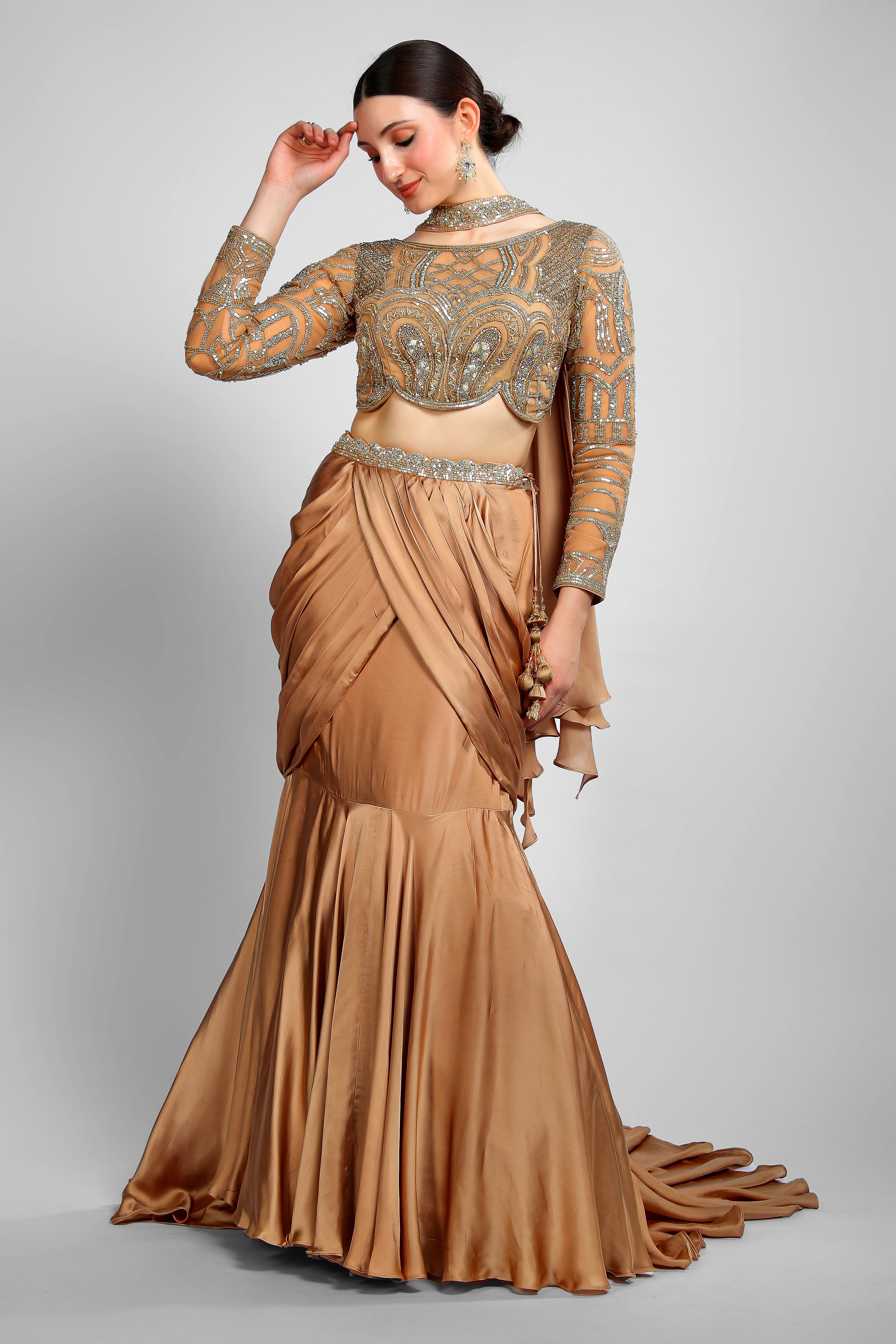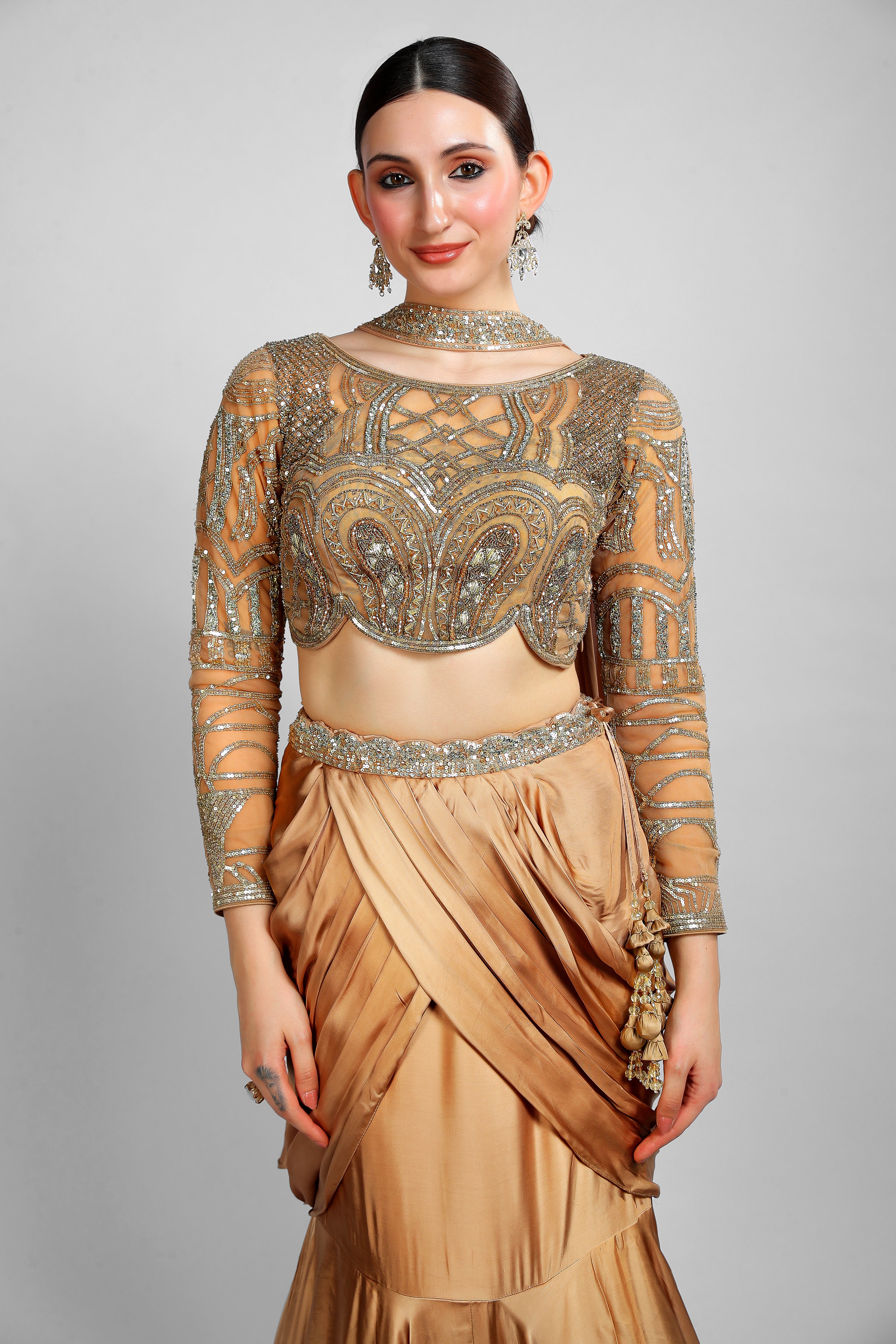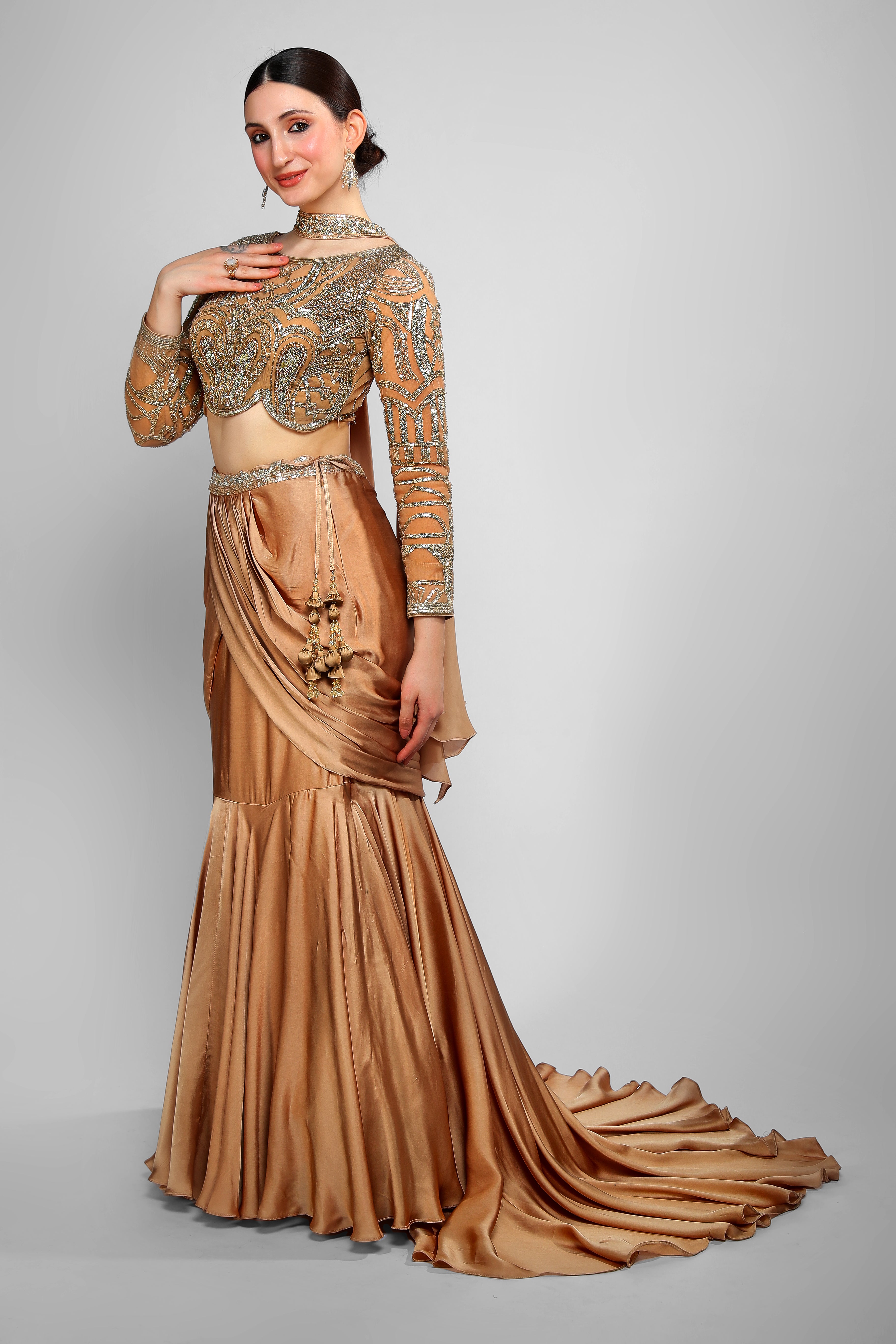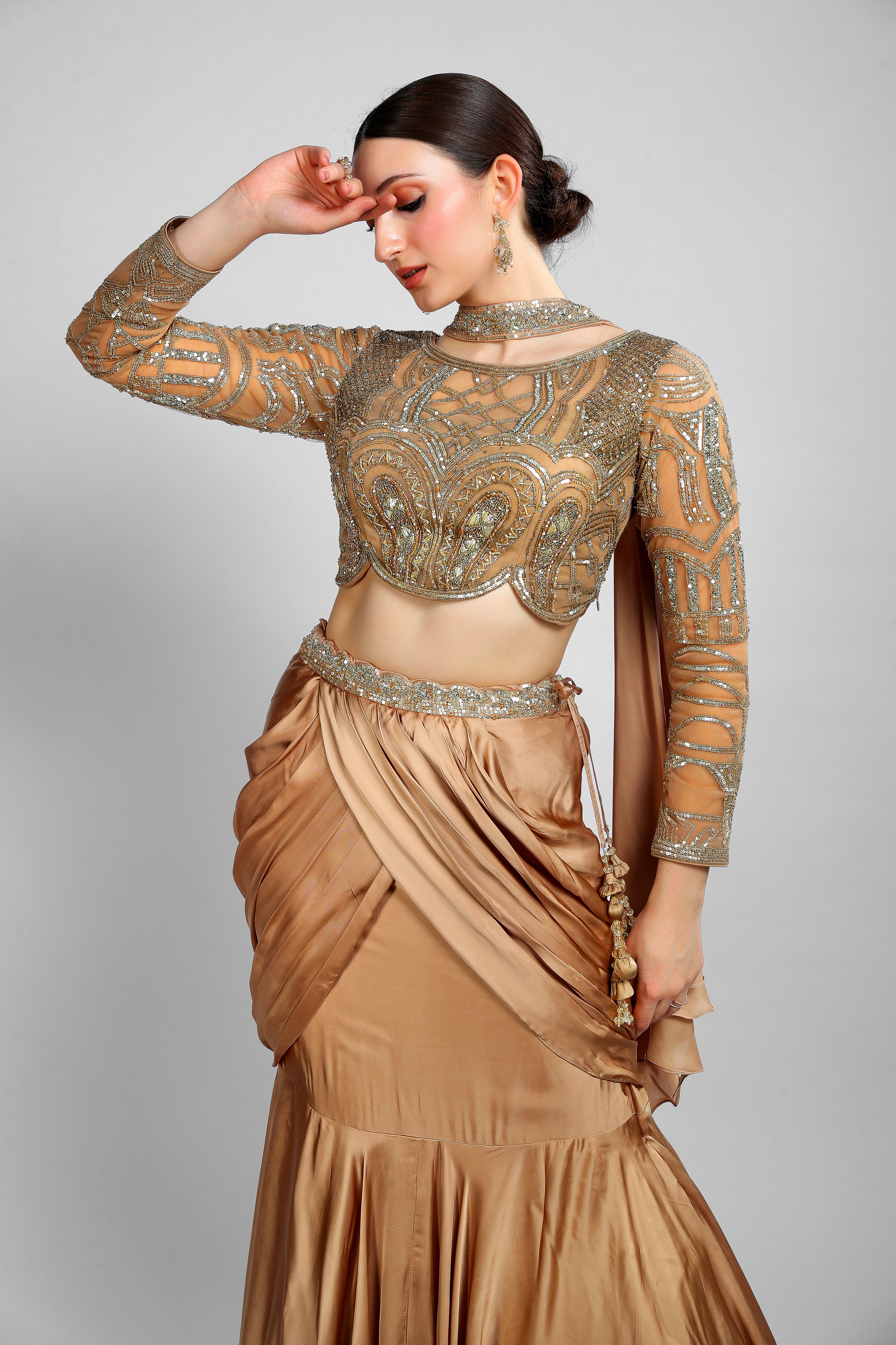 Silhouette: Structured Blouse with Flowing Trail Lehenga