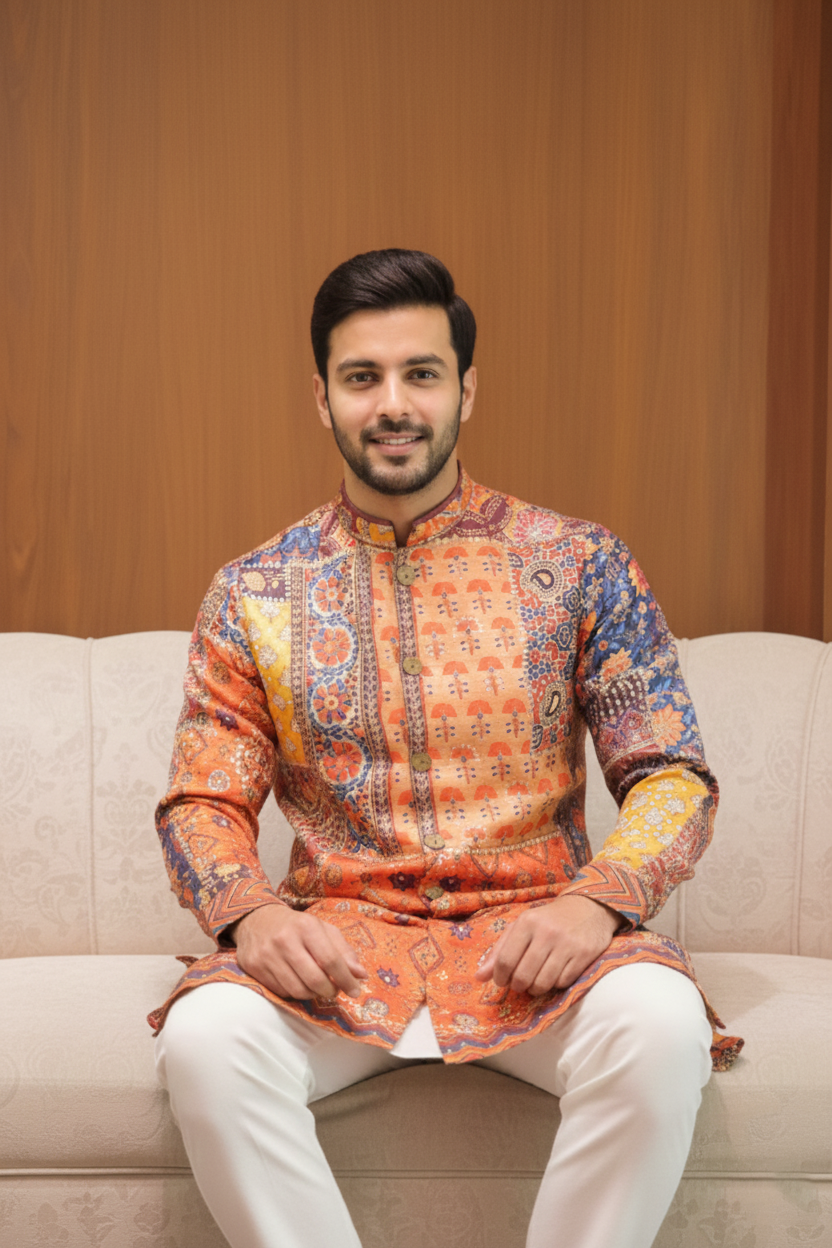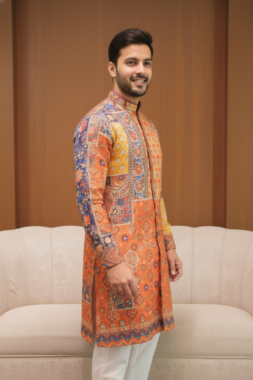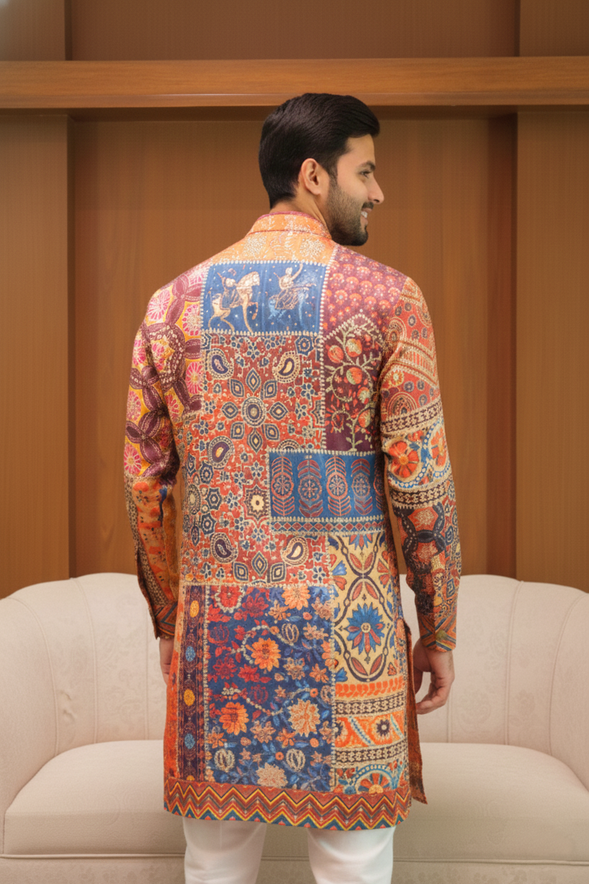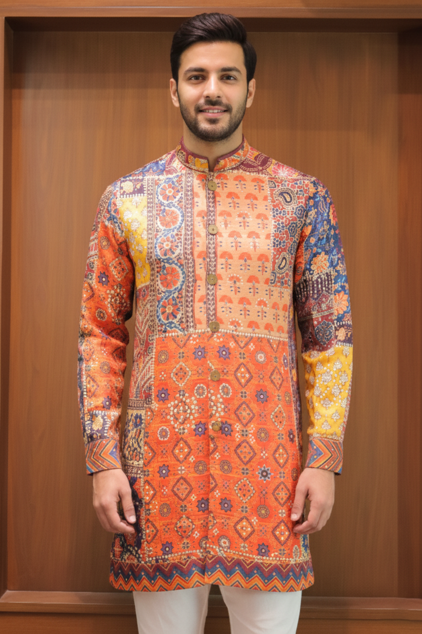 Sunset Patchwork Heritage Kurta celebrates traditional artistry with a vibrant patchwork-inspired blend of geometric and floral motifs. Crafted from premium fabric on a warm sunset-orange base with blue and mustard accents, it features a contrast placket, handcrafted buttons, detailed cuffs, and an intricately patterned hem—perfect for festive and cultural occasions.
