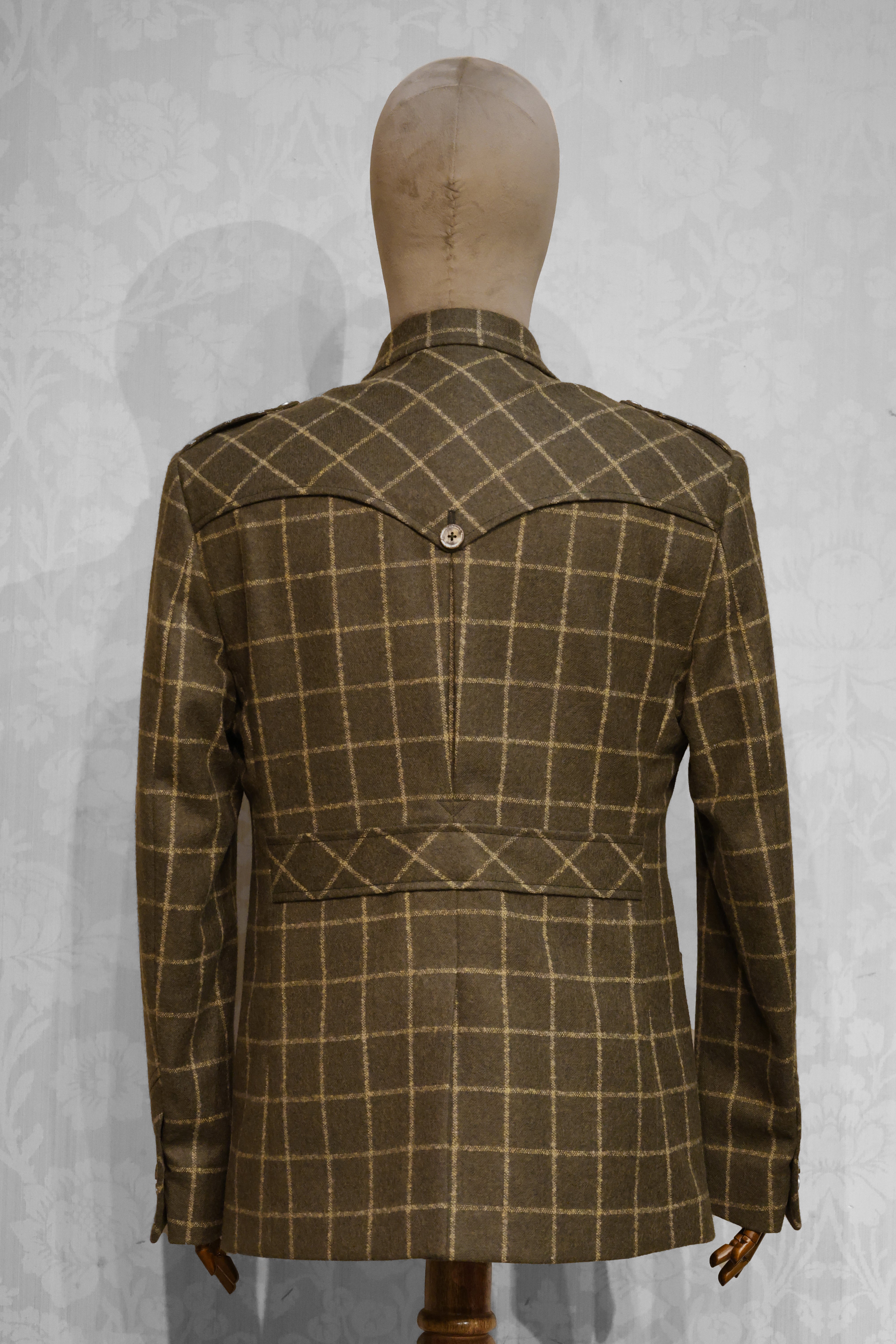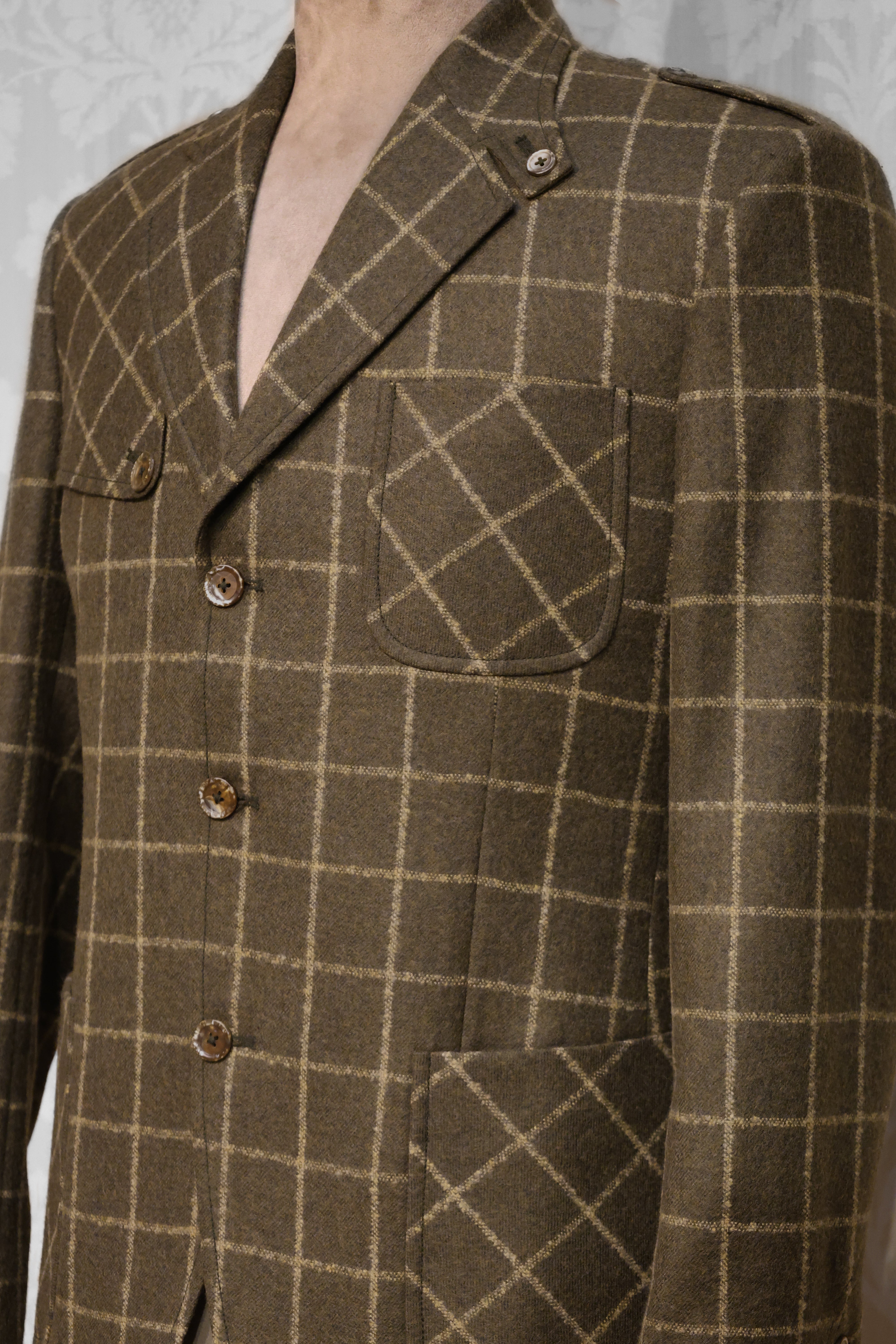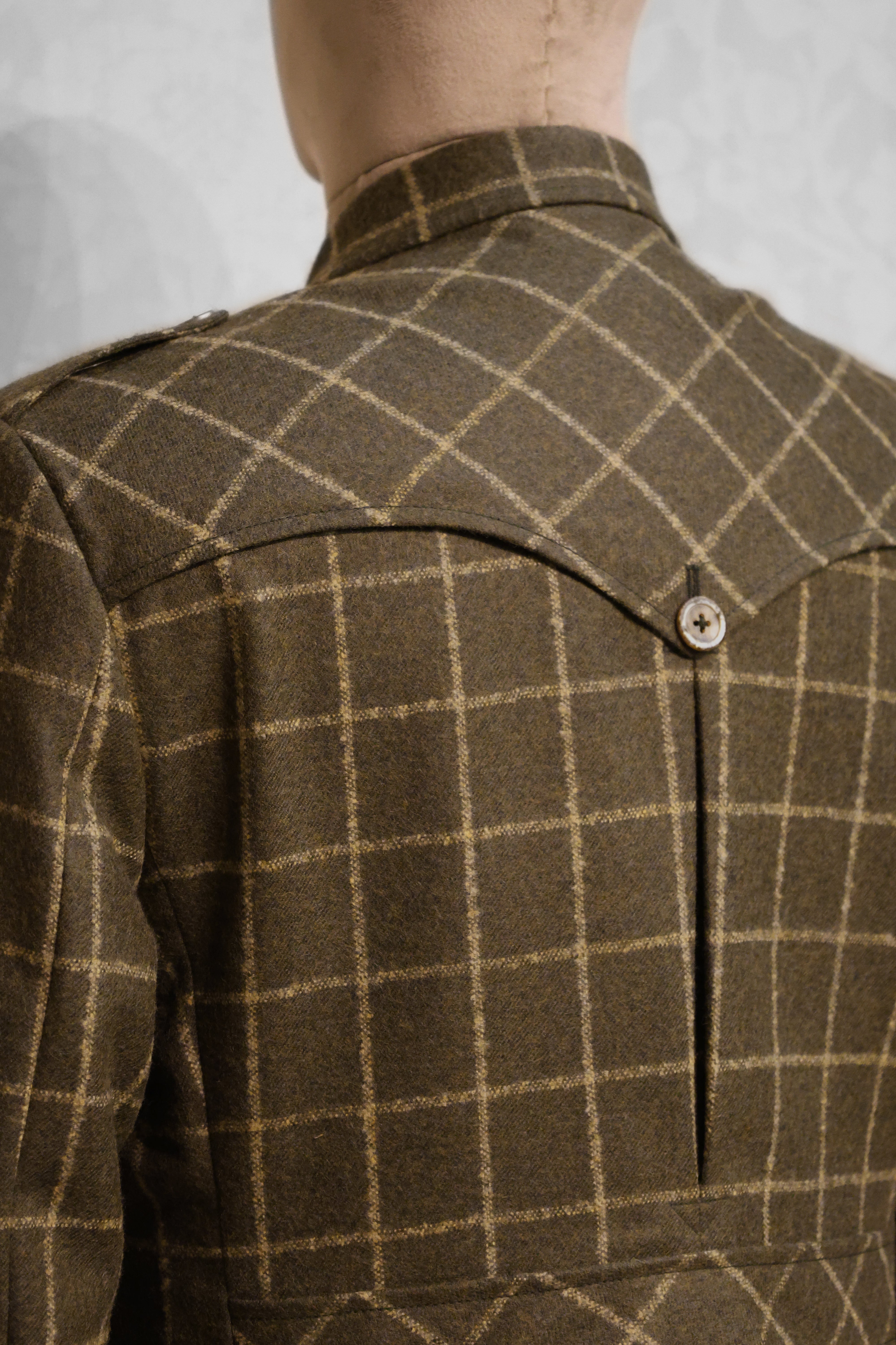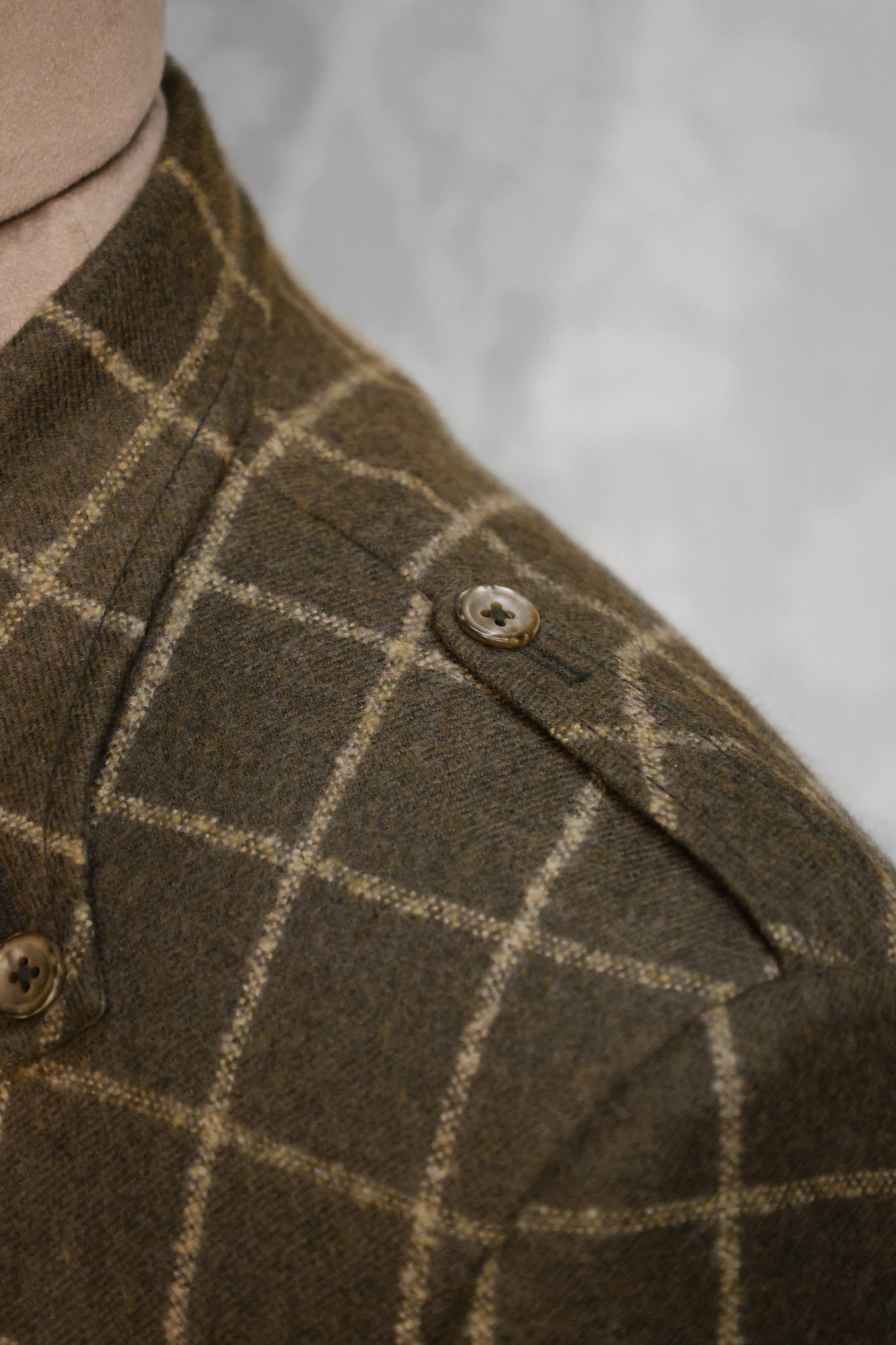 The Vintage Olive Checkered Wool Blazer is a refined statement piece, blending classic craftsmanship with contemporary tailoring. Featuring a distinguished checkered pattern, this blazer is crafted from a high-quality wool blend, offering warmth and durability. The elongated collar and structured silhouette add a touch of sophistication, while the buttoned flap pockets and epaulet detailing provide a unique, vintage-inspired aesthetic. Ideal for smart casual and formal occasions, this blazer is a versatile addition to any gentleman’s wardrobe.