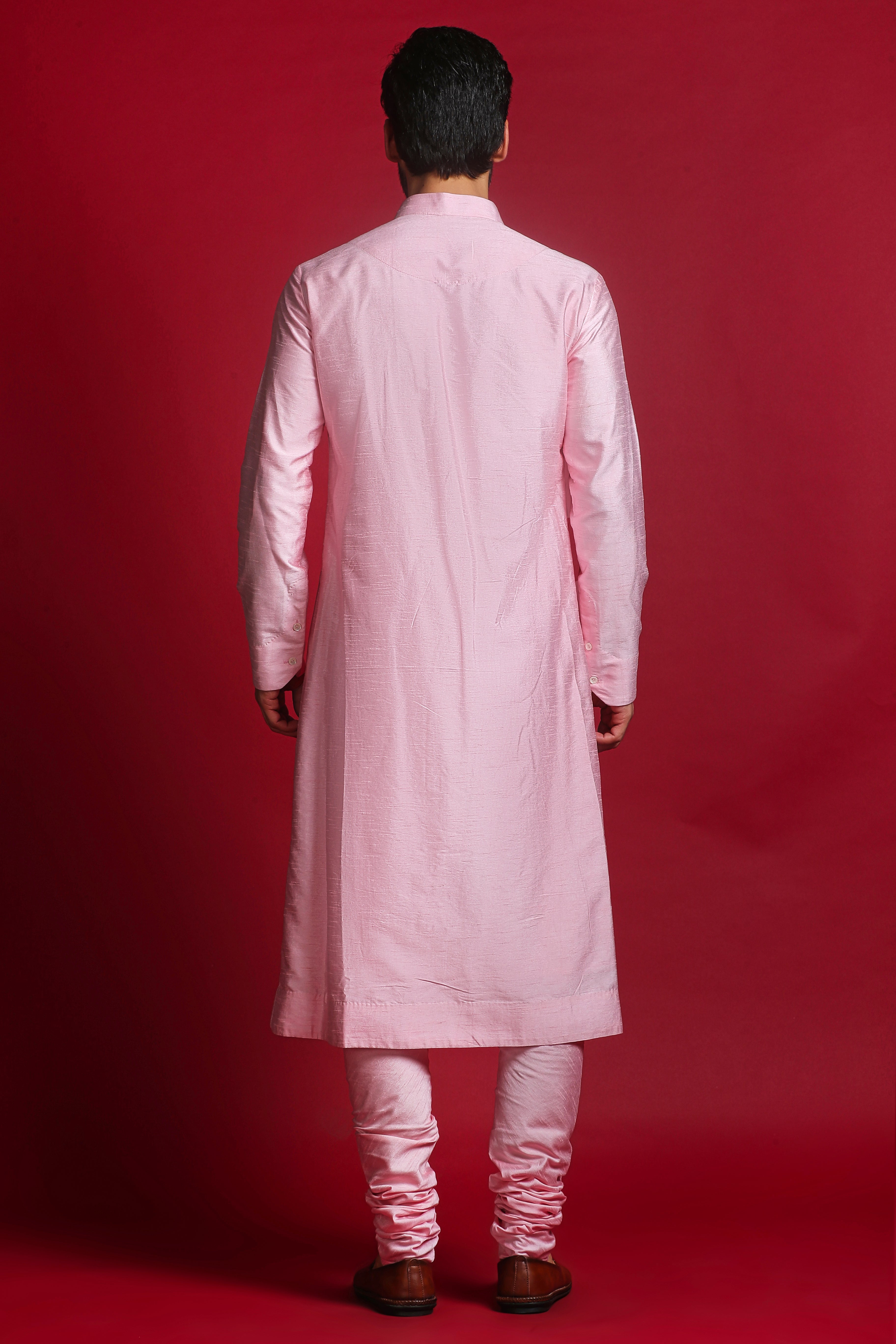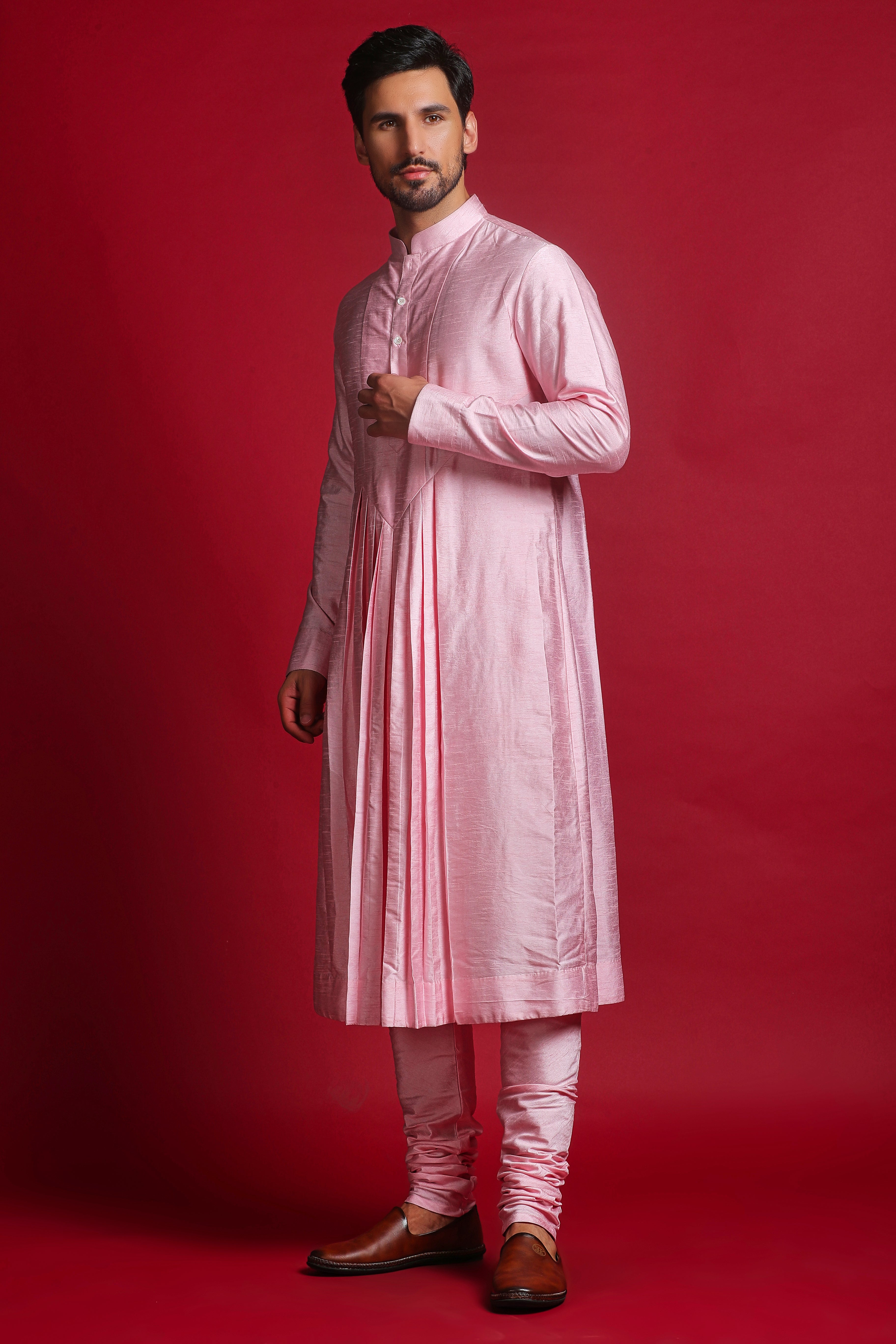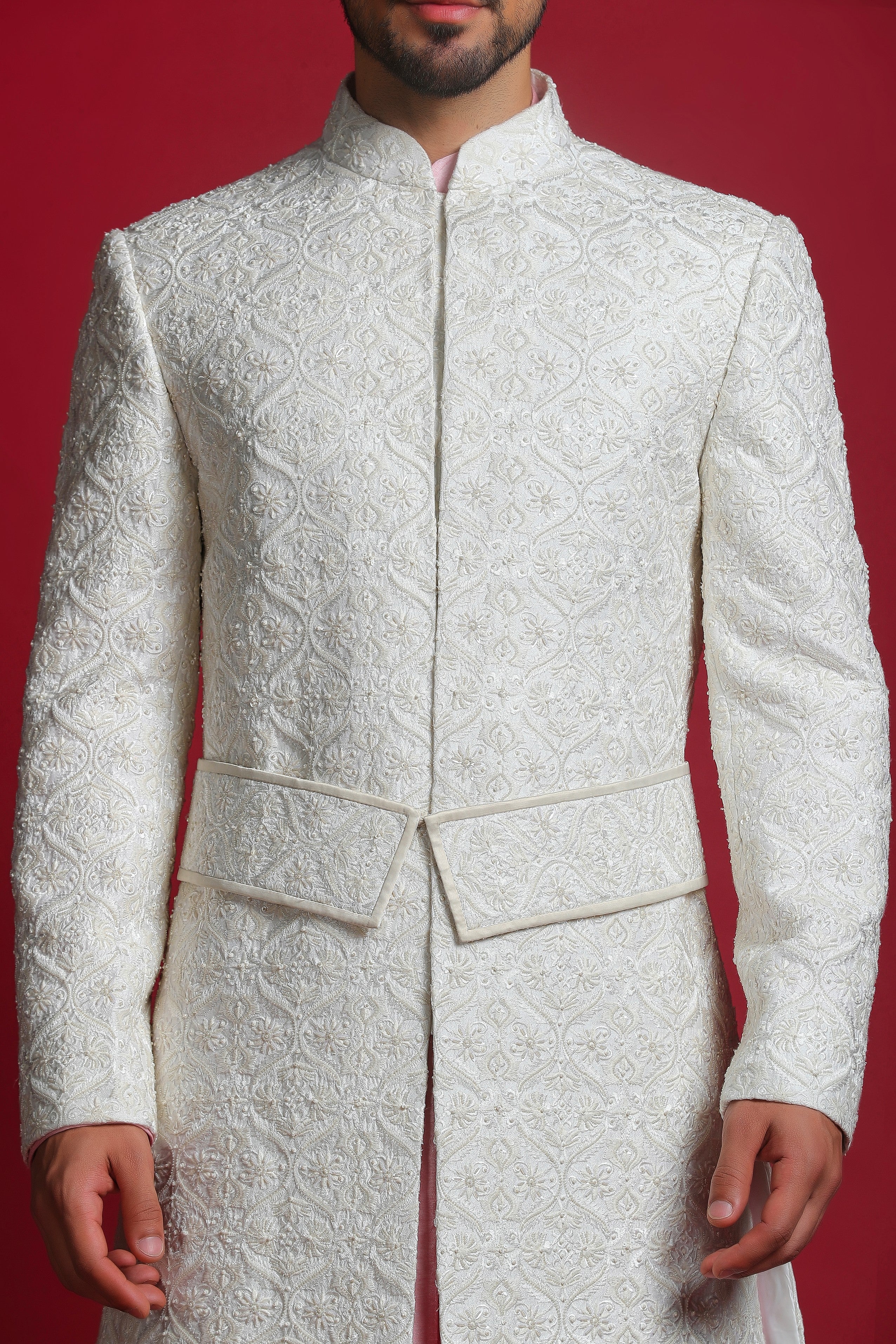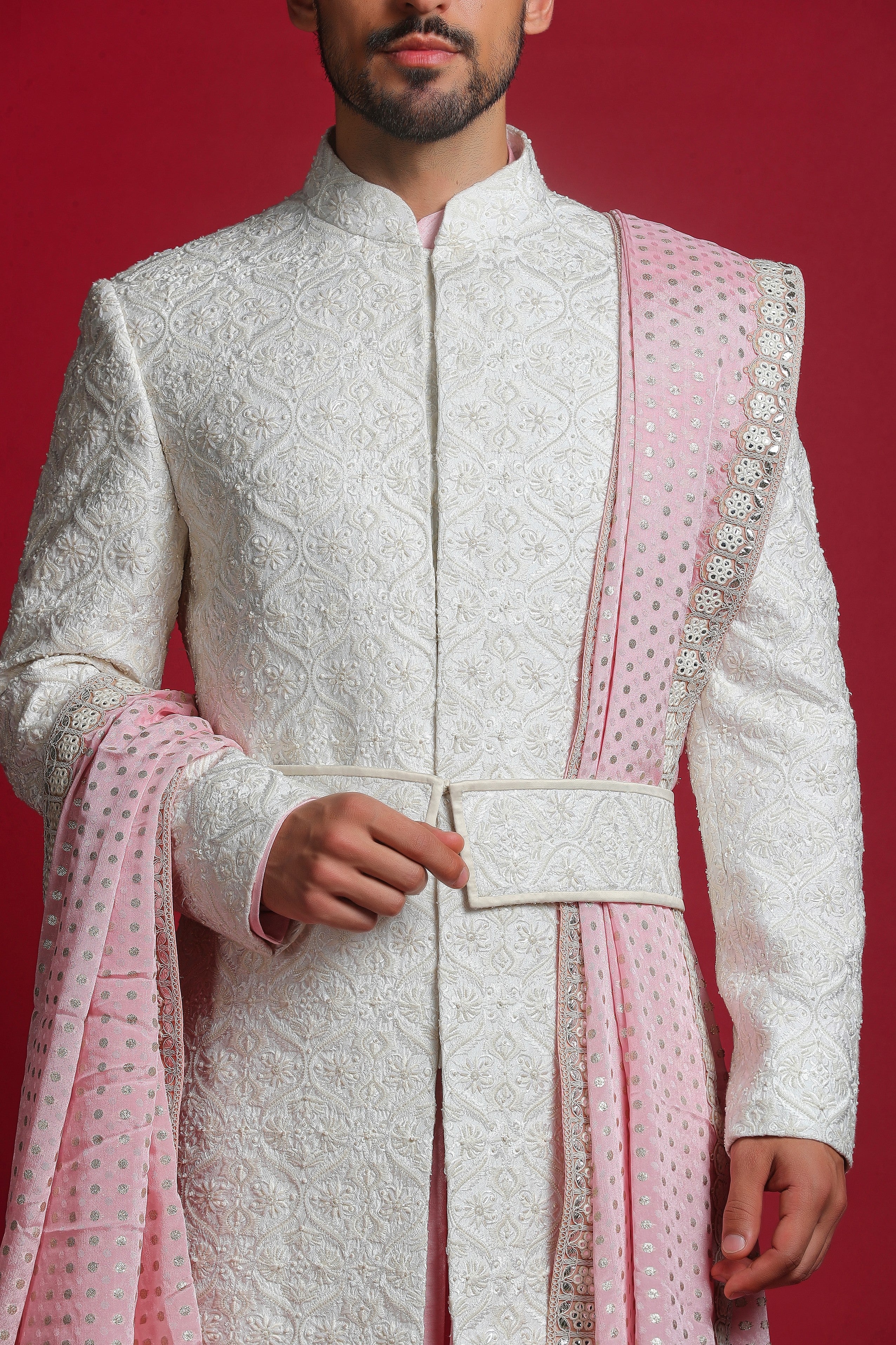 Introducing the Royal Cream & Pink Embroidered Sherwani Set, this sherwani is adorned with self-thread embroidery, featuring intricate detailing of sequins and beads, giving it a truly royal touch. Paired with a contrasting pink kurta, churidar, and a matching pink stole, this ensemble blends elegance and sophistication, making it ideal for grand occasions.